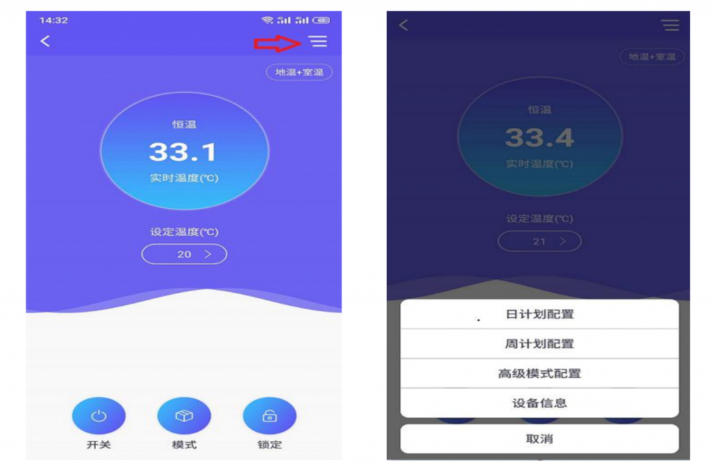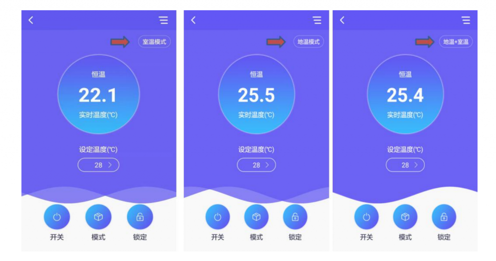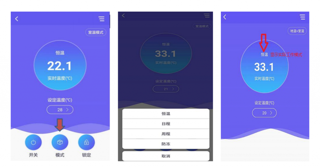 点击模式图标,可选“恒温”,“日程”,“周程”,“防冻”