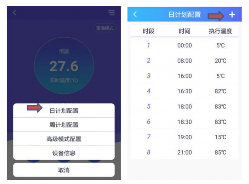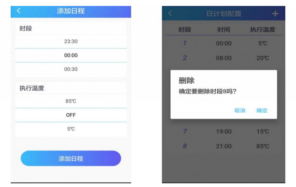 默认三时段,点击右上角“+”最高可添加至 8 段,时间由小到大顺序,点击时间/温度可进 行设置