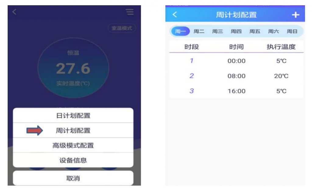 点击“周计划配置”用户可分别设置周一至周日每天不同时段的时间和温度,点击右上角“+” 可添加时段,温控器始终按照这一周的设置运行。