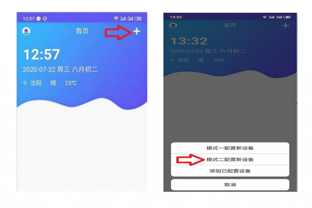 1.点击右上角“+”进入下一页面,选择“模式二配置新设备”