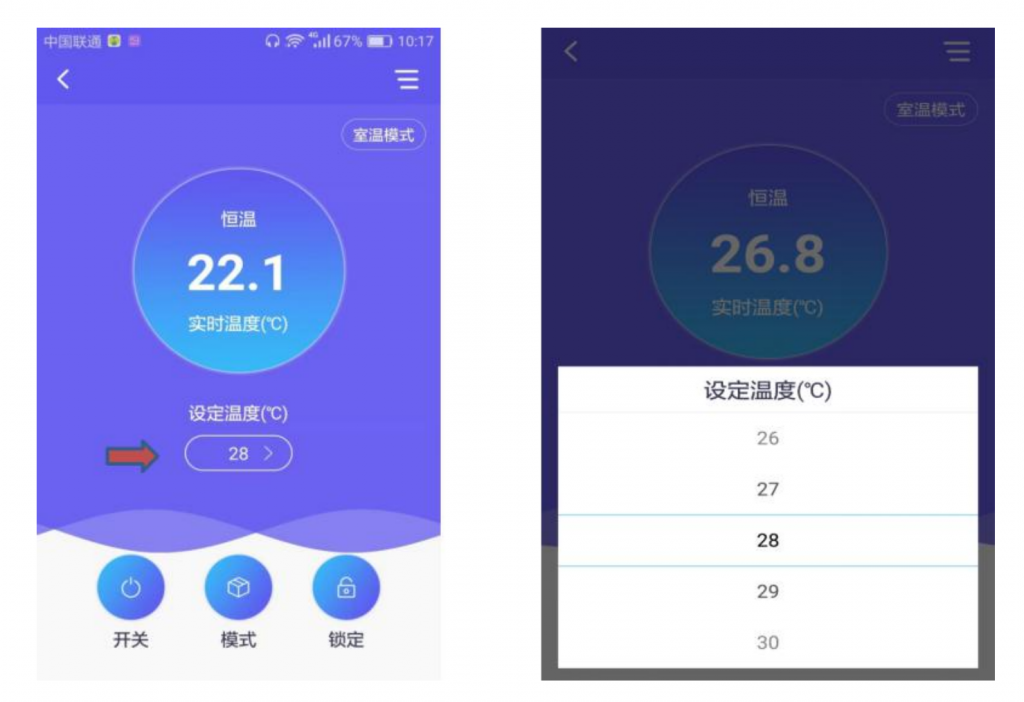 点击设定温度数字,进入设定页面 上下滑动选择要设定的温度值